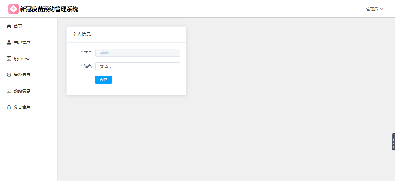 管理员:首页(数据图表统计);用户信息管理;疫苗种类管理;号源信息管理;预约信息管理;公告信息管理;个人信息;密码修改;