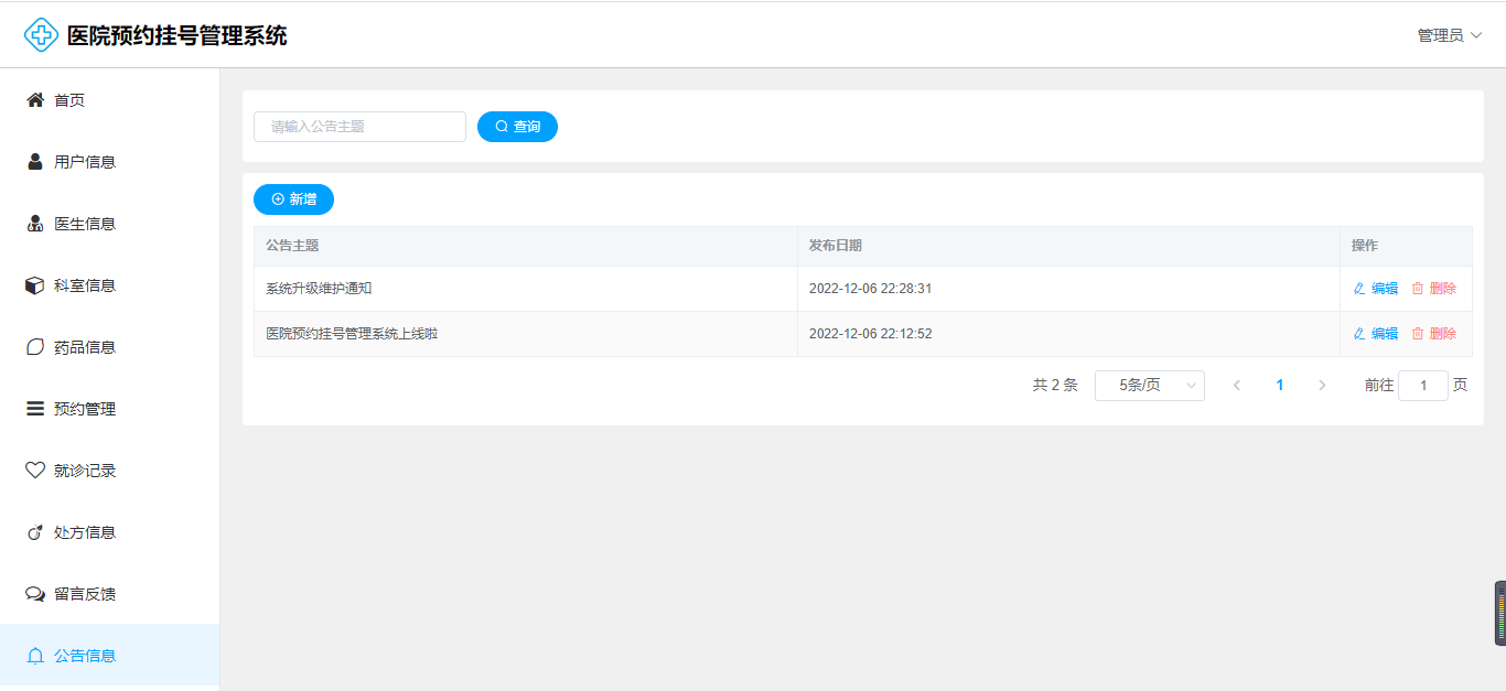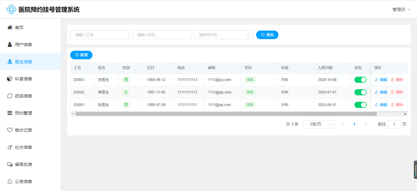 基于springboot+vue前后端分离的医院预约挂号管理系统(源码+文档),系统包含管理员、医生、用户角色,功能如下: