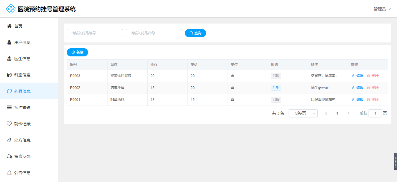 管理员:登录;首页(科室人员统计、营业额统计);用户管理;医生管理;科室信息(根据科室查看医生);医生排班和号源管理;药品管理;预约管理;就诊记录;处方信息;留言反馈;公告信息;个人信息;密码修改;
