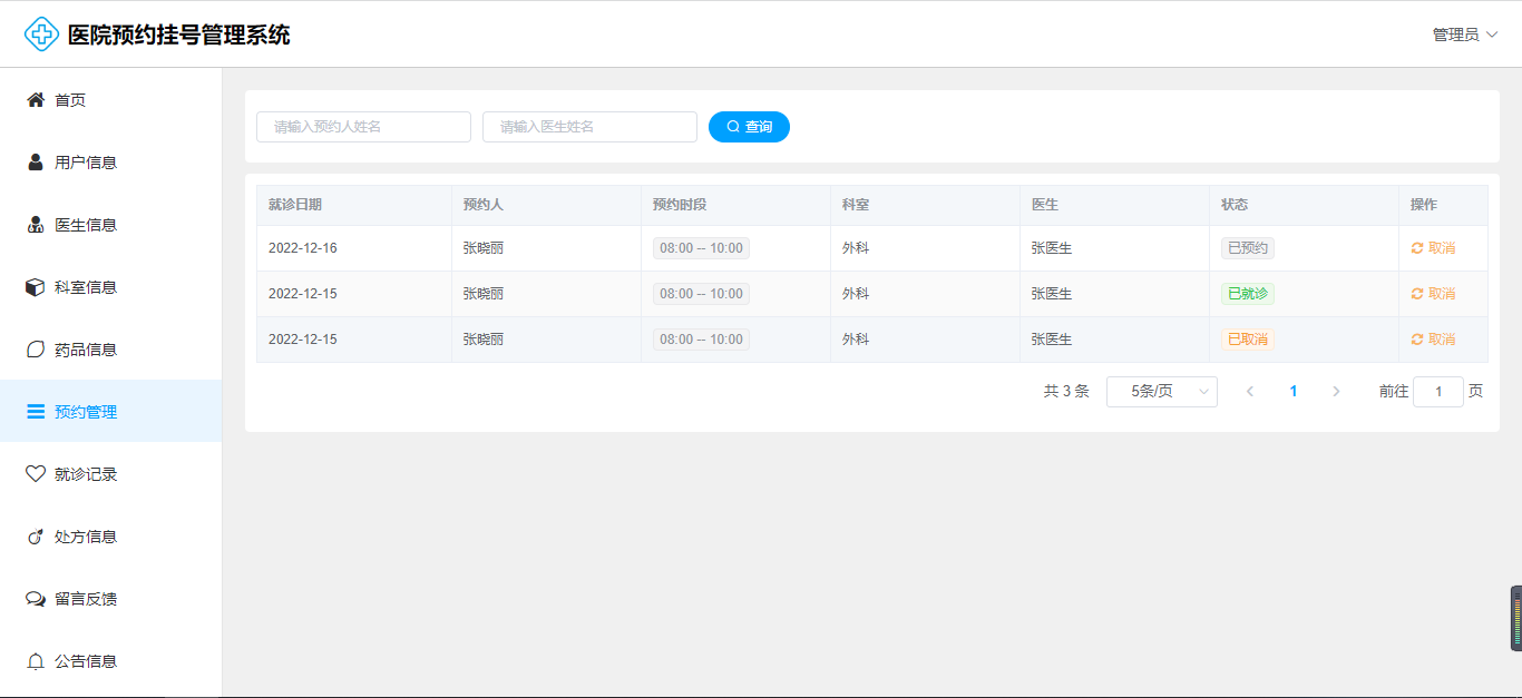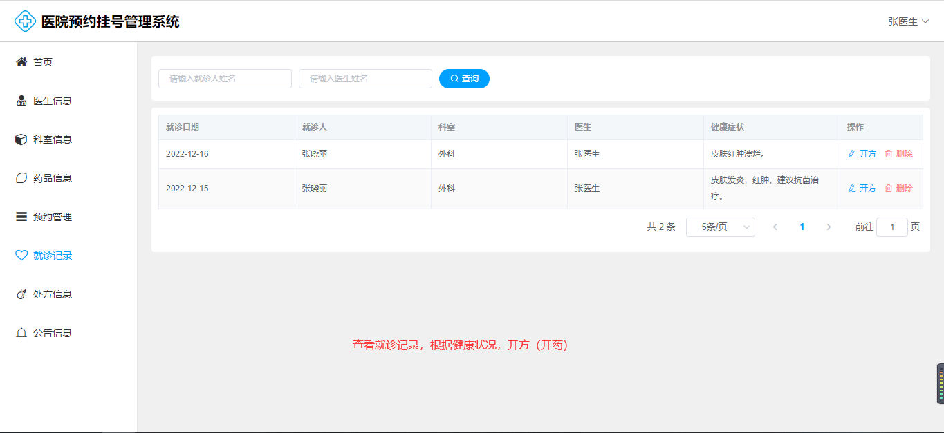 用户:查看医生;查看科室(根据科室查看医生);我的预约查看;我的就诊记录;我的处方信息(配药);留言反馈;系统公告;个人信息;修改密码。