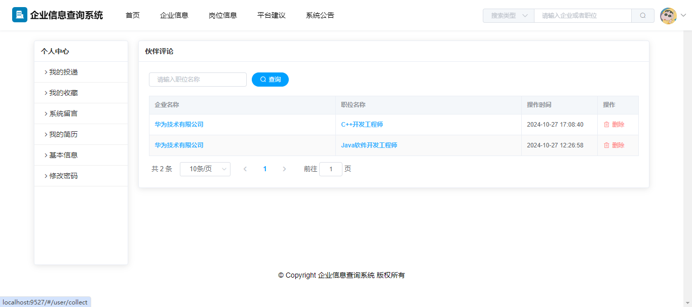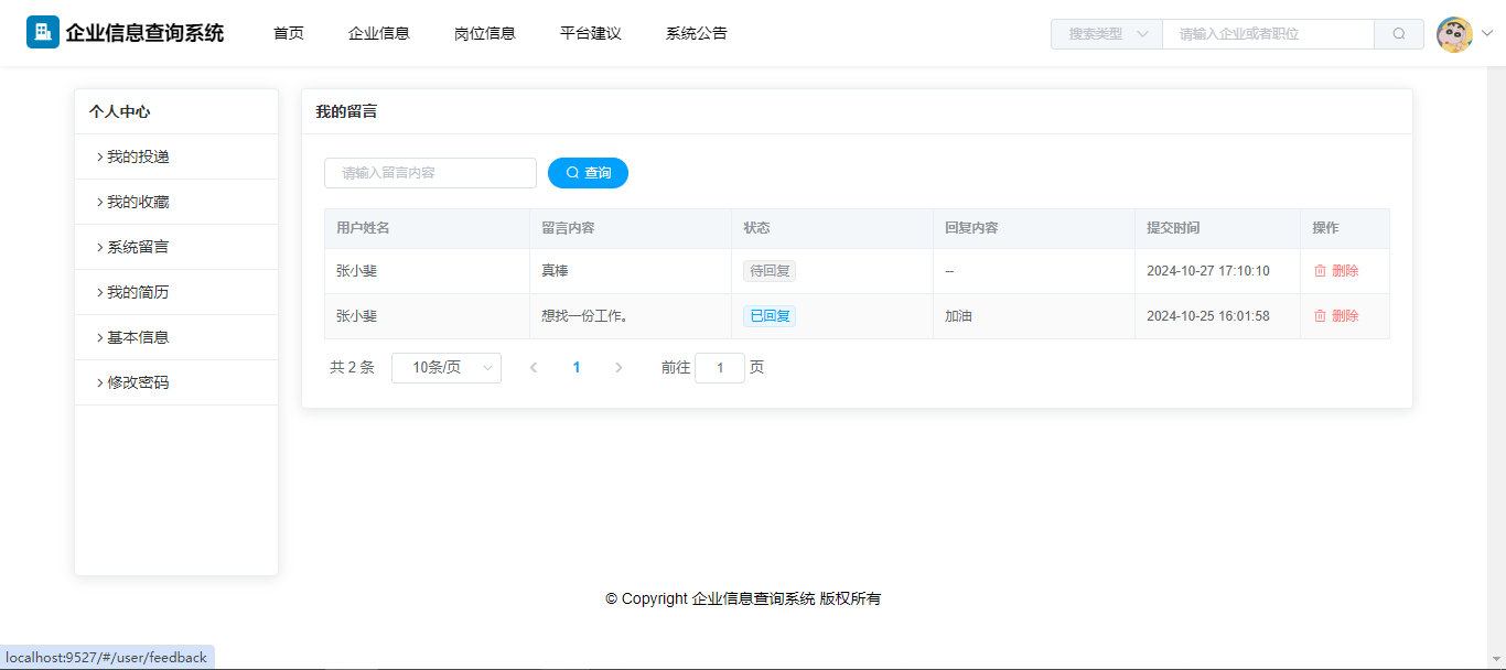 用户:首页;企业查询;职位查询(收藏、投递);平台建议;系统公告;用户还具有个人中心功能,可以管理我的投递、我的收藏、系统留言、我的简历、基本信息、密码修改。