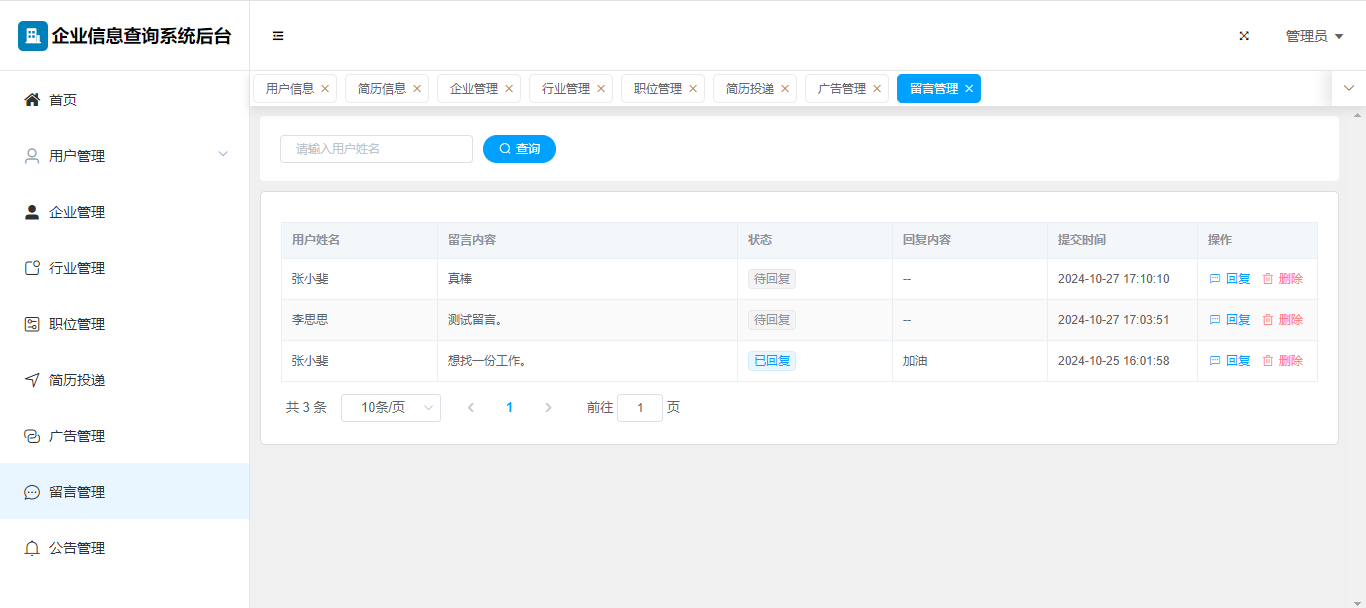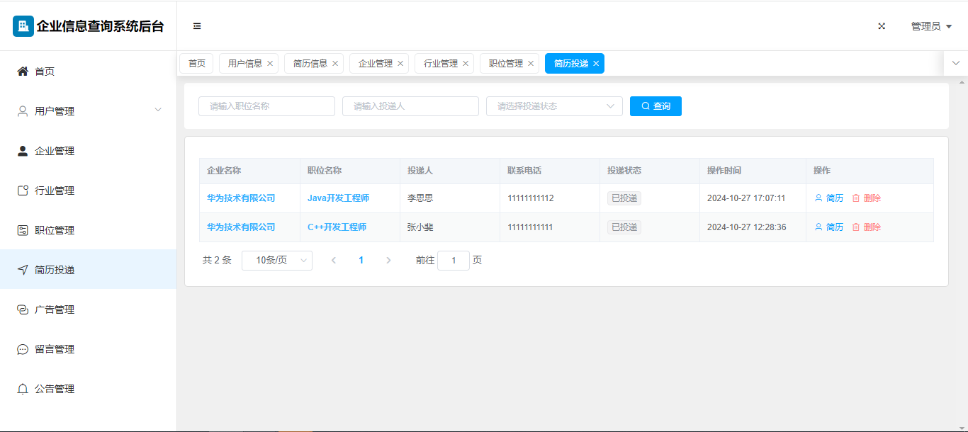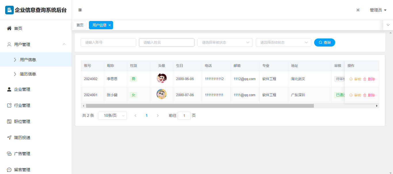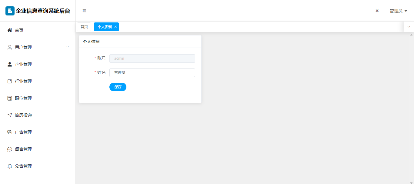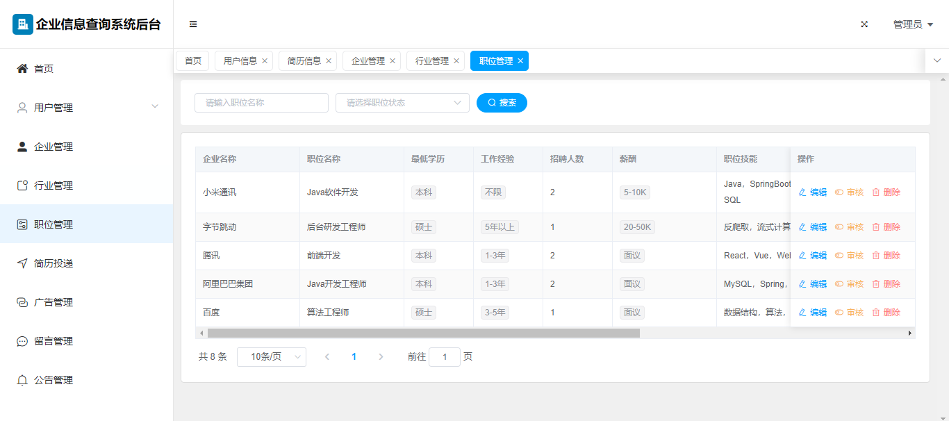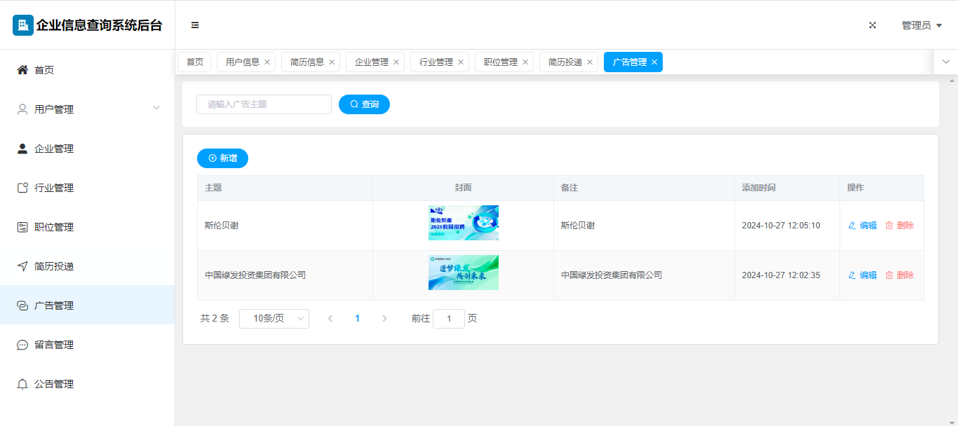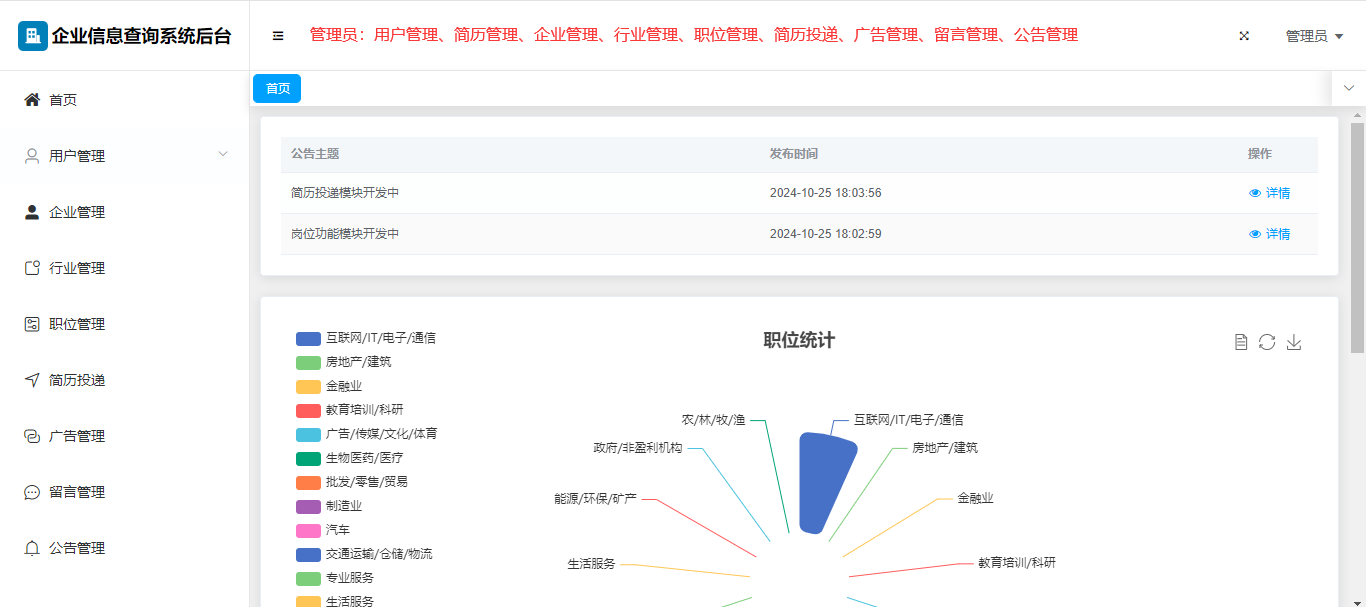 管理员:首页统计;用户管理;简历管理;企业管理;行业管理;职位管理;简历投递;广告管理;留言管理;公告信息;个人信息;密码修改;