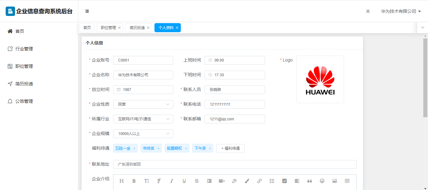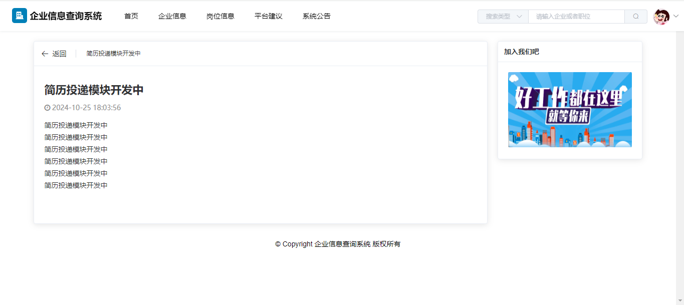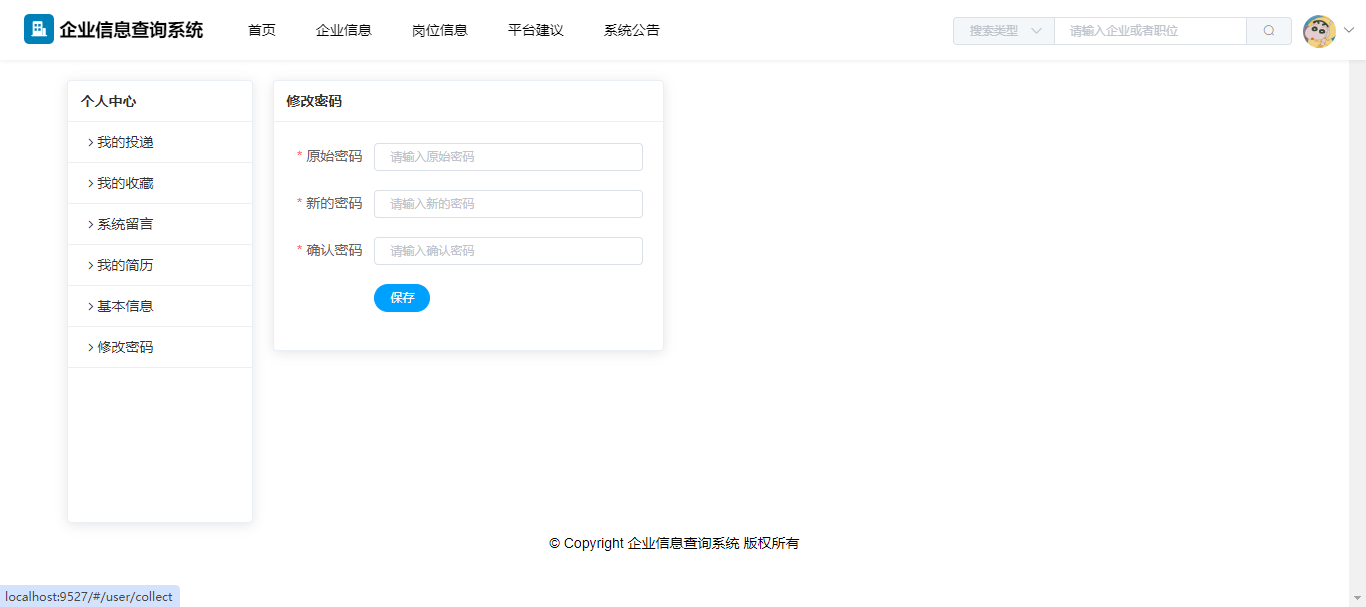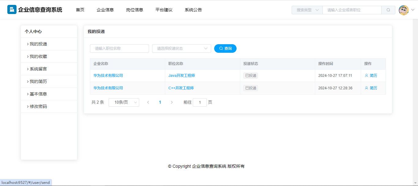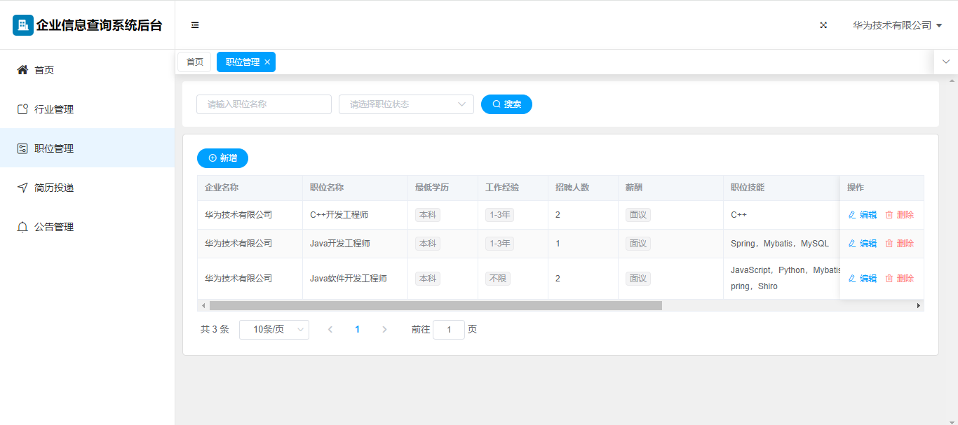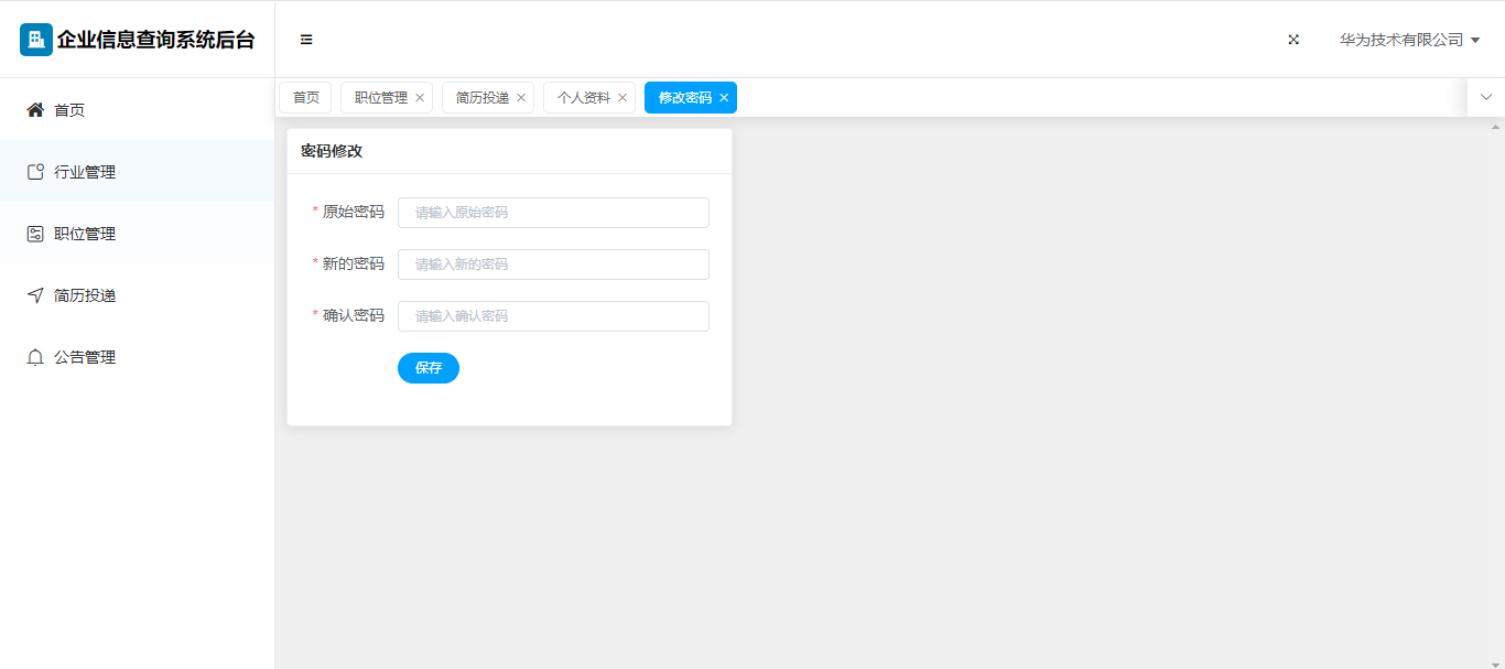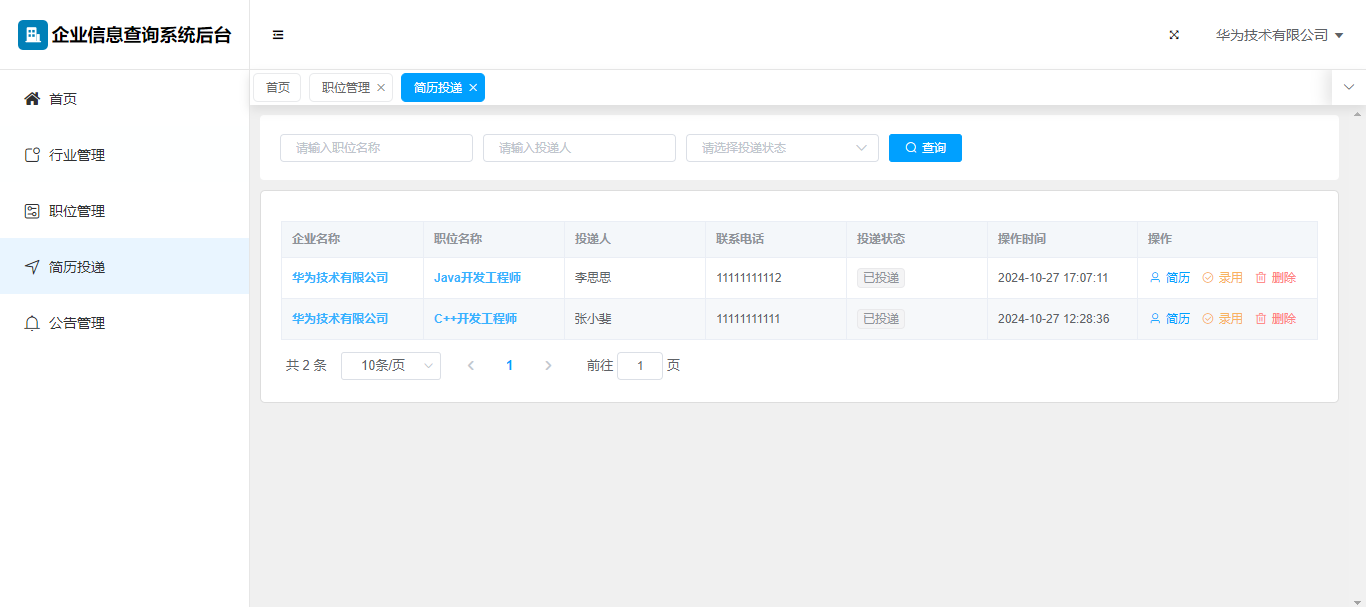 企业:行业查看;职位管理;简历投递;公告查看;个人信息修改;密码修改。