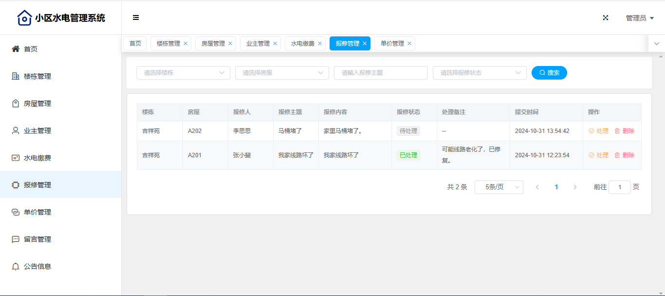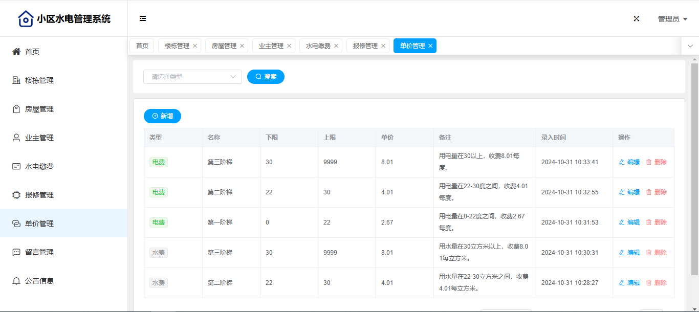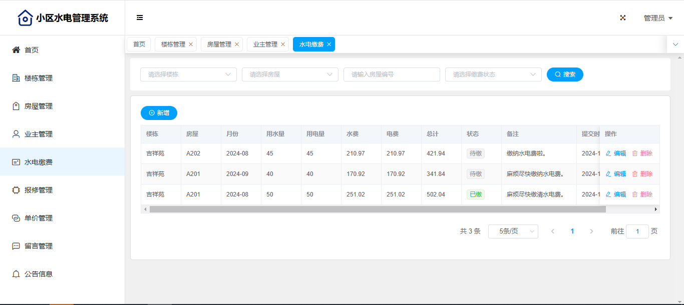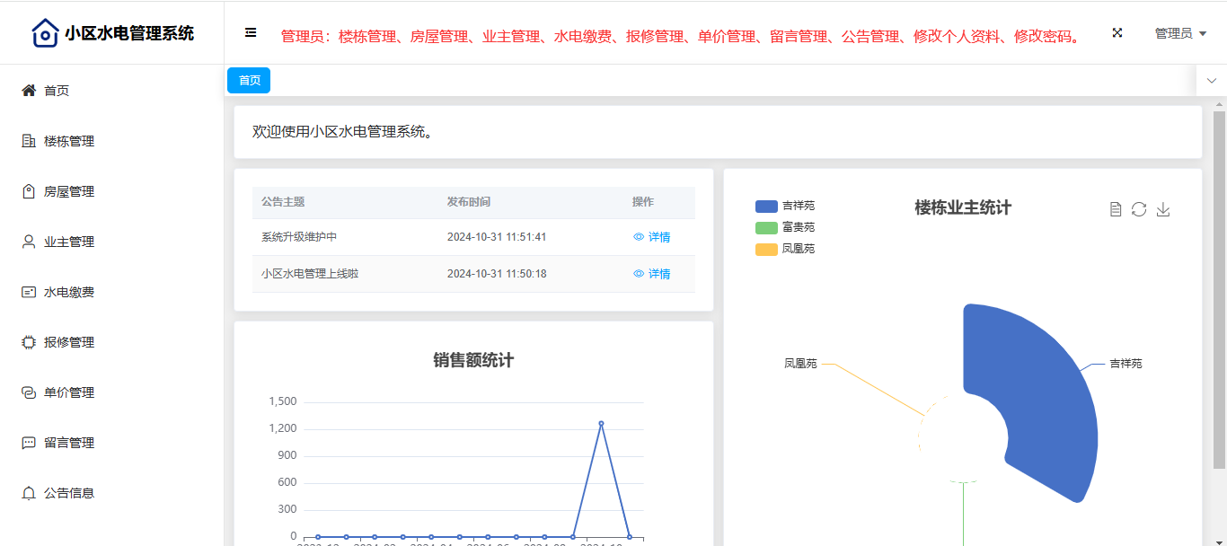 管理员:首页统计(楼栋居民统计、水电费统计);楼栋管理;房屋管理;业主管理;水电缴费;报修管理;单价管理;留言管理;公告信息;个人信息;密码修改;