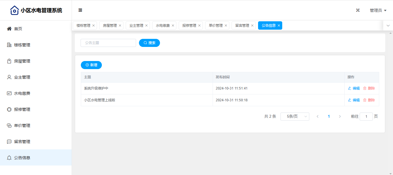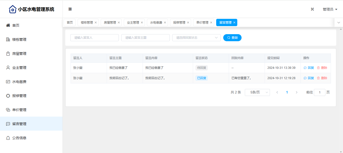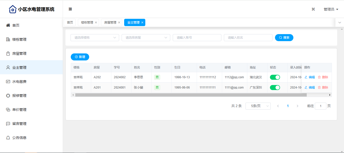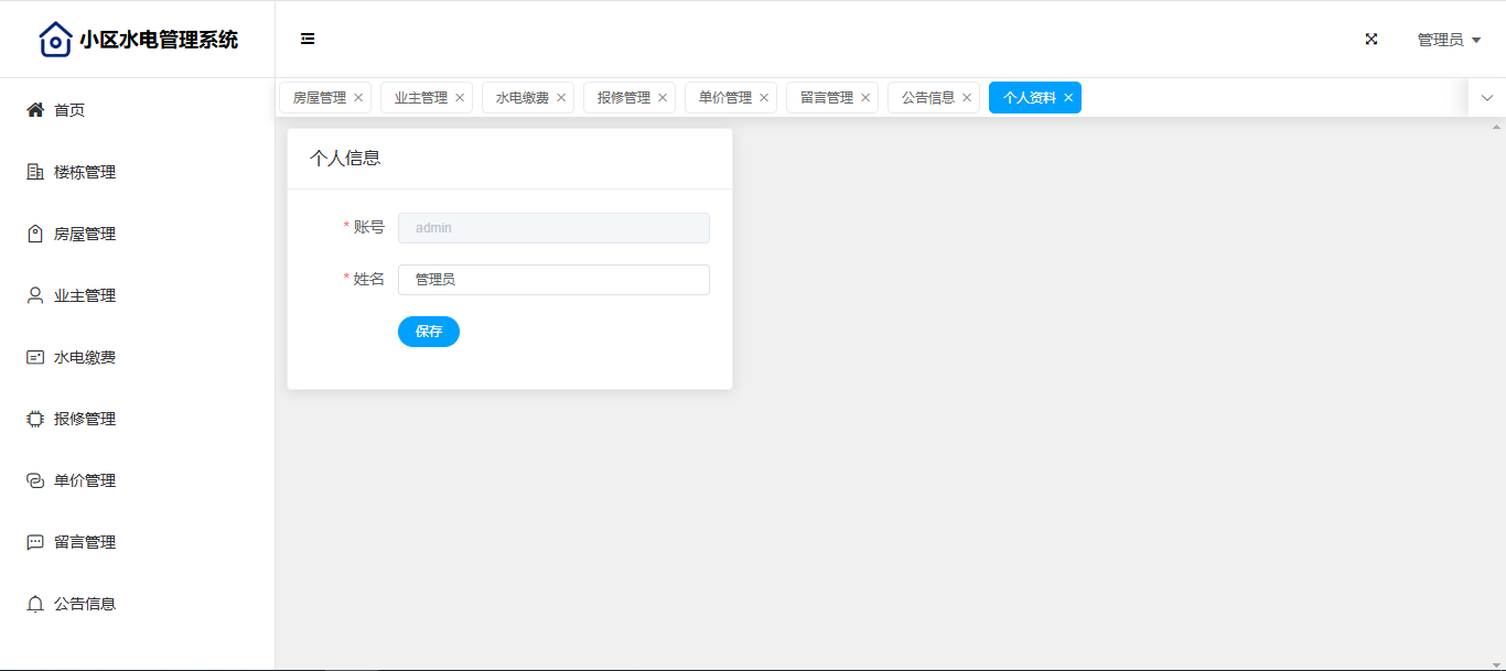 管理员:首页统计(楼栋居民统计、水电费统计);楼栋管理;房屋管理;业主管理;水电缴费;报修管理;单价管理;留言管理;公告信息;个人信息;密码修改;