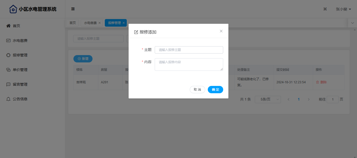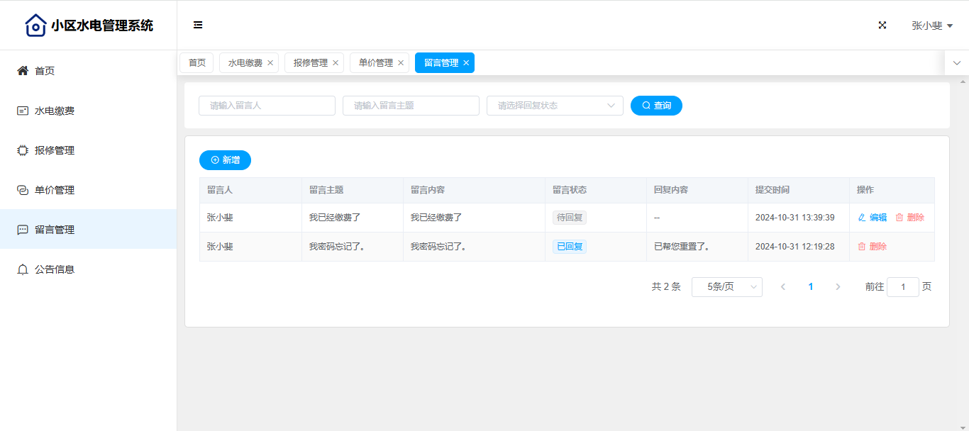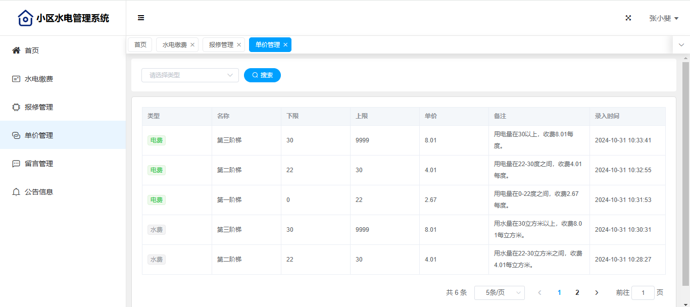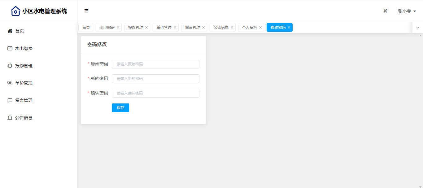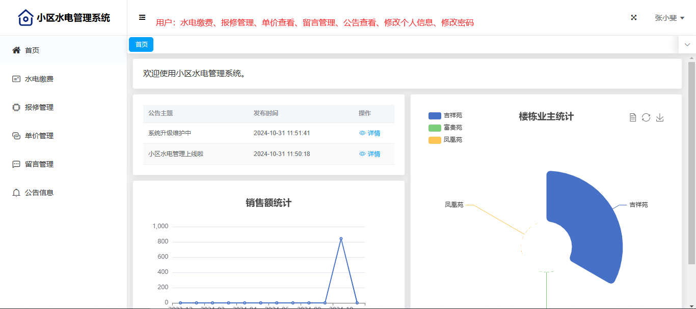 用户:首页统计;水电缴费;报修管理;单价查看;留言管理;公告查看;修改个人资料;密码修改。